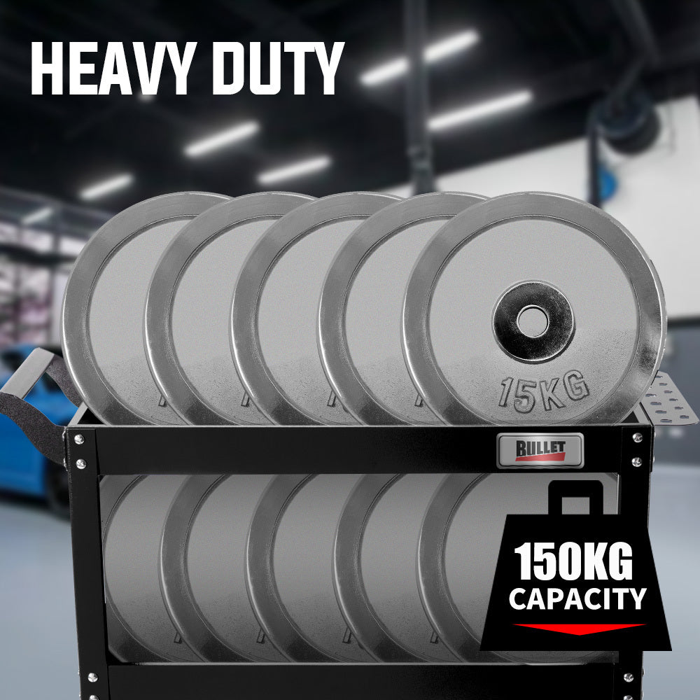 The Bullet 3-Tier Steel Tool Cart is a must-have for tackling jobs anywhere around your garage, warehouse or workshop. This heavy-duty manoeuvrable storage solution has a load capacity of 150kg---plenty for all your tool and accessory transport needs!