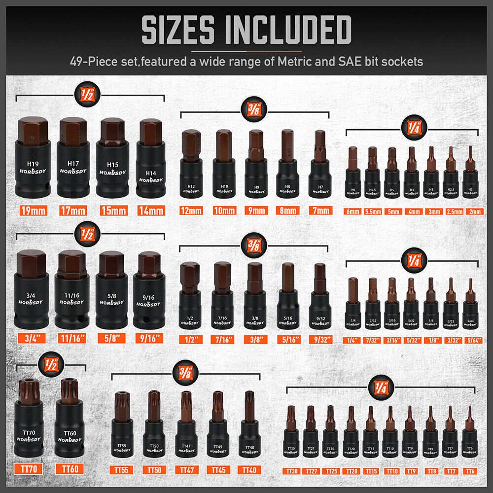 COMPLETE KIT - This comprehensive set includes T6-T70 star bits, E4-E24 E-Torx, and both metric and SAE hex socket bits, providing the perfect tools for any task, whether using a driver, wrench, or ratchet.