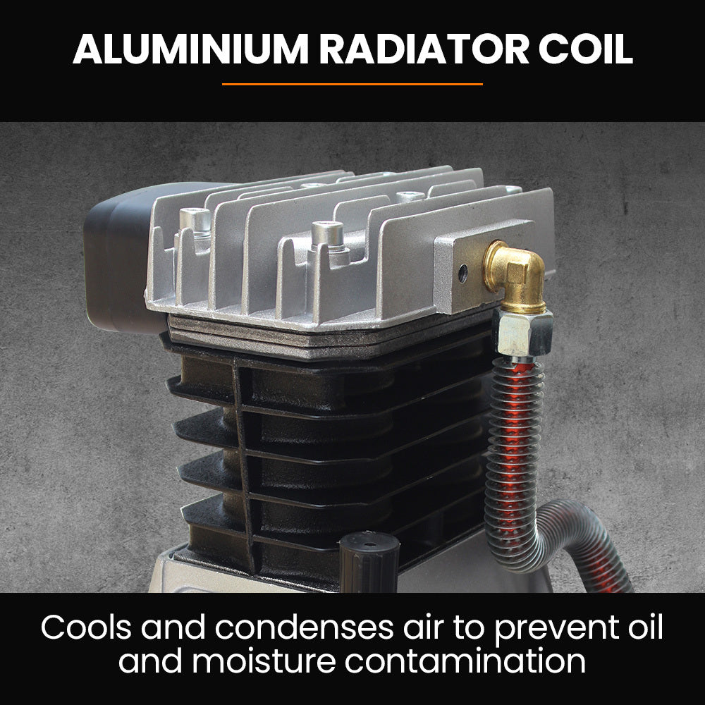 The heart of this machine is a robust cast iron parallel twin-cylinder compressor with aluminium pistons. An integrated aluminium after-cooler, assisted by the integrated fan in the drive pulley, ensures less moisture and contamination in your air hose. The cooler output air temperature also contributes to the compressor's overall efficiency and performance. The unit also features a pump speed of 920 rpm and a duty cycle of 0.75, ensuring consistent and reliable performance. The pump has an outstanding air displacement of 280L/Min (9.9 CFM), giving it powerful air delivery for demanding applications.